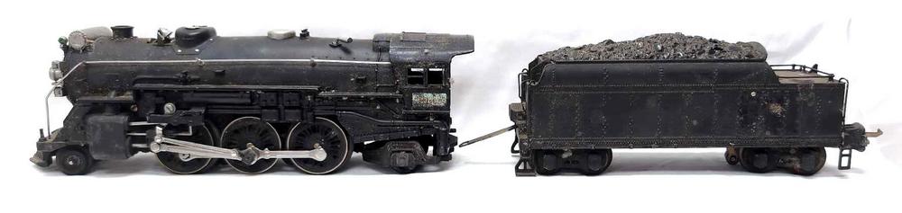 DescriptionPrewar Lionel O Gauge 225E 2-6-2 steam locomotive and 2235W tender with whistle. Loco and tender have some repainting/custom painting, some rust and oxidation. Trains appear to not have any missing parts, all parts appear to be original. Trains will clean to look better. Please view the photos of the items in this lot carefully as they are being sold as they are shown in our photos with NO returns or refunds.