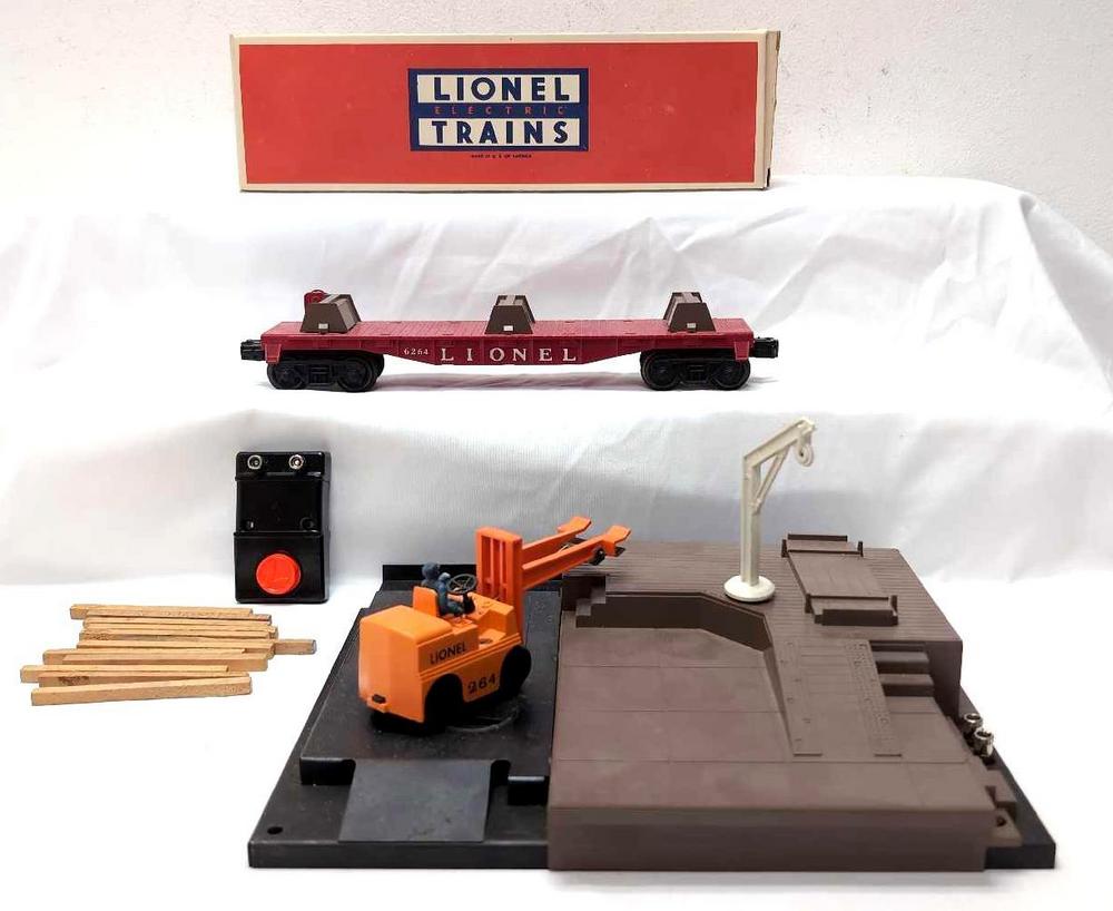 DescriptionPostwar Lionel O Gauge 264 Forklift Loading Platform operating accessory with 6264 Flatcar with lumber. Boom is partially missing a tab. Platform base has some rust forming, otherwise nice clean C6+. Flatcar looks C7. Reproduction box included for 6264, great for storage and shipping.