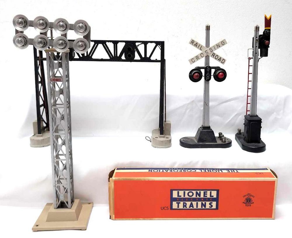 DescriptionPostwar Lionel O Gauge UCS Remote Control Track Set, 151 Automatic Semaphore signal, 154 Automatic Highway Flasher, 195 Railroad Yard Floodlight tower, 450 Overhead Signal Bridge. UCS has hardened and brittle cord, unrun with instructions sheet, box is a brick. 151 has a custom painted flag/blade. Accessories otherwise range C6-7.