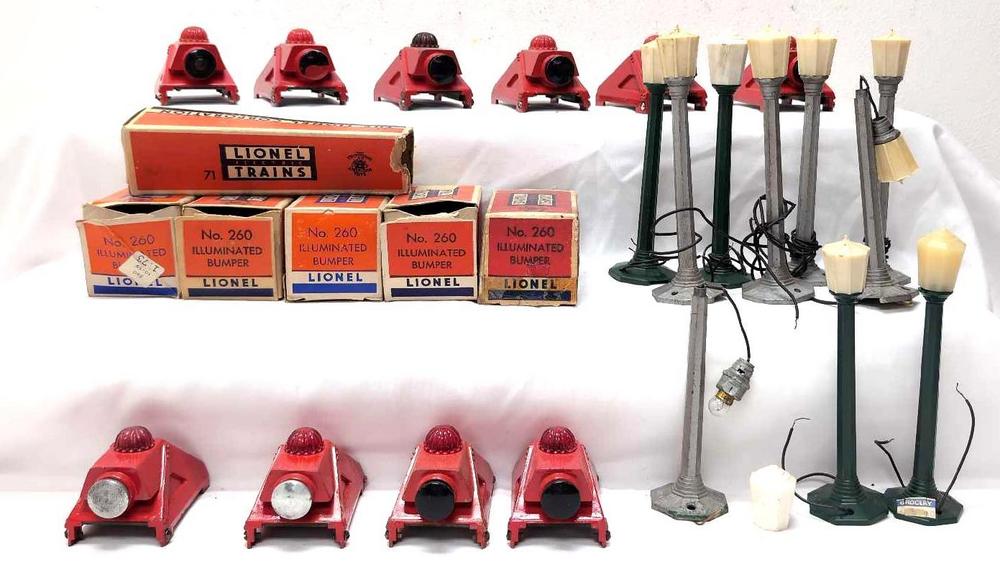 Postwar Lionel O Gauge; Eleven 260 Bumpers (two aluminum plunger variation) with five original boxes, C6 some missing flaps, some glossy variation. Six 71 Lamp Posts, C6 one original box missing flaps. Four 76 plastic Lamp Posts, C6.