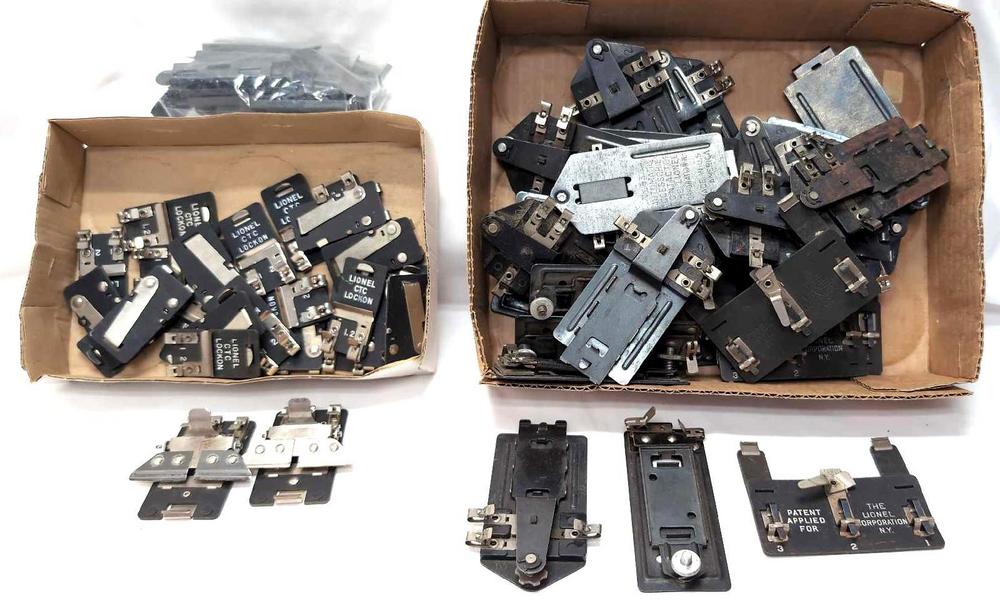 DescriptionPrewar, Postwar and Modern Era Lionel O Gauge Eight 145C, Two 154C, Fifteen 153C, Twenty-four CTC Lockons, Fifty-three O Gauge track ties/keepers, Four unnumbed three contact/connection track lockons (two are O Gauge and two are Standard Gauge). Items in this lot range from C6 used with some light rust to NOS New Old Stock, unused C8-9.