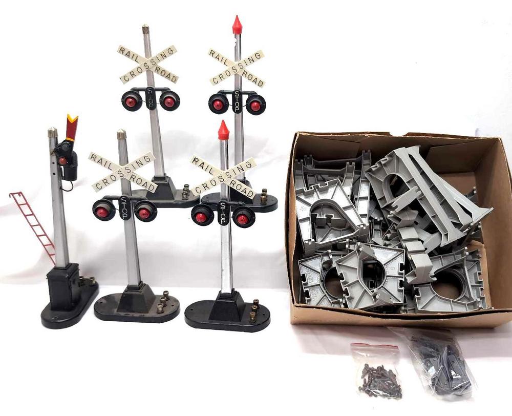 DescriptionPostwar Lionel O Gauge 151 Automatic Semaphore with custom painted flag/blade, four 154 Automatic Highway Crossing Flashers and 110 Trestle Set. 110 may or may not be complete with some metal components, two 154 have custom finials. Please view the photos of the items in this lot carefully as they are being sold as they are shown in our photos with NO returns or refunds.