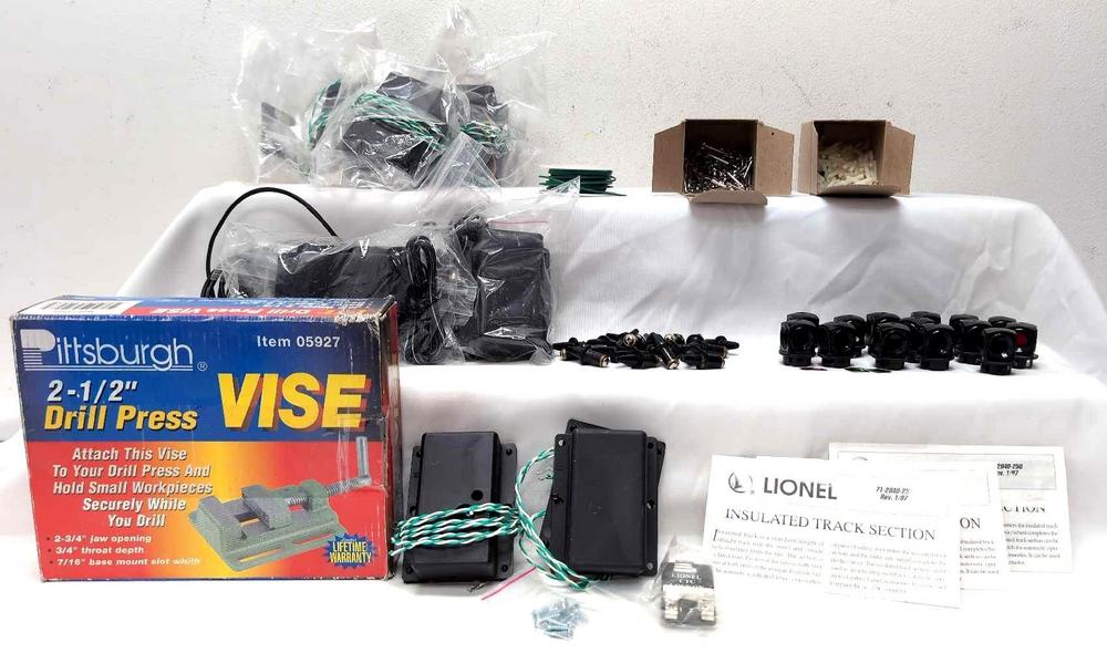 DescriptionPostwar Lionel 022 lanterns, track pins, fixed voltage plugs, electronic parts each with a CTC Lockon, pliers, craft vise, more. Please view the photos of the items in this lot carefully as they are being sold as they are shown in our photos with NO returns or refunds.