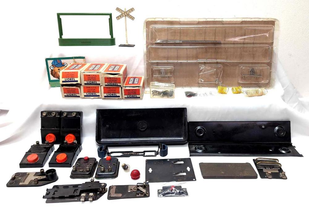 DescriptionPostwar Lionel O Gauge LTC lockon, OTC lockon, 90 control switch, 96 control switch, 153C Accessory Contactor, 310 Billboard frame, 309 Yard Sign, 160 bin, box/stock frame and more. Reproduction/replacement handrails and walkways for FM Trainmaster. Please view the photos of the items in this lot carefully as they are being sold as they are shown in our photos with NO returns or refunds.