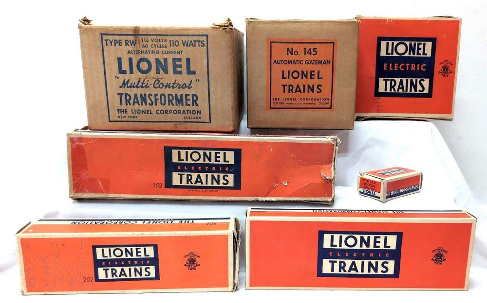 DescriptionPostwar Lionel O Gauge Type RW transformer, 145 automatic gateman, 89 flagpole, 959 Barn Set, LTC illuminated lockon, 152 automatic crossing gate, 252 automatic crossing gate, empty original boxes. RW shows light wear, no missing flaps. 145 is missing an inner flap and flap material. 89 is missing an inner flap, otherwise brick like. 959 lid is missing the tuck flap. LTC is a Brick. 152 has tape repairs and missing flaps. 252 has missing flaps, hand writing and Madison Hardware sticker.