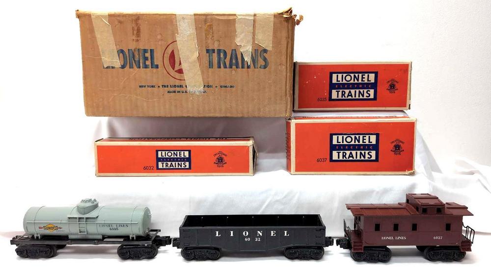 DescriptionPostwar Lionel O Gauge Outfit No. 1501S O27 Freight Train with Smoke set original box with 6032 gondola in original box, 6035 Sunoco single dome tank in original box and 6037 Lionel Lines caboose in original box. Trains are clean C6+/C7. Car boxes missing flaps, detached flaps, tape repairs. Set box has masking tape, light wear to flaps and folds. Box is fairly square and solid.