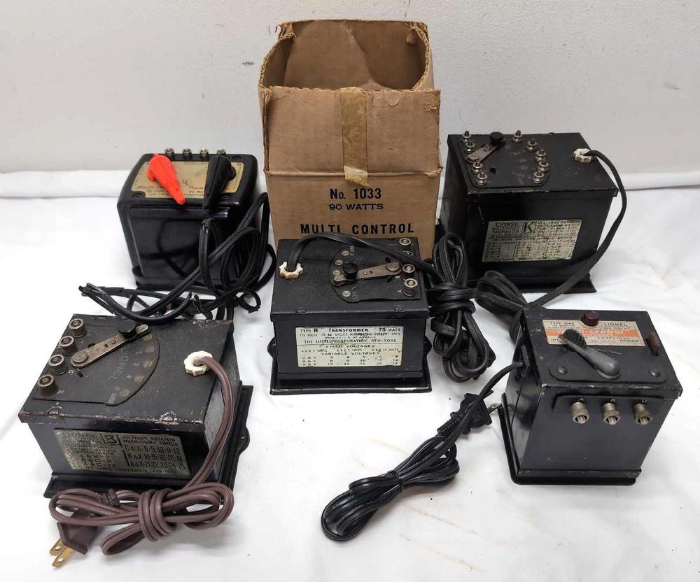DescriptionLionel transformers 1033 in box with brittle cord and problems with whistle actuator. 1042, B, H and K with replaced cords and or plugs. Please view the photos of the items in this lot carefully as they are being sold as they are shown in our photos with NO returns or refunds.