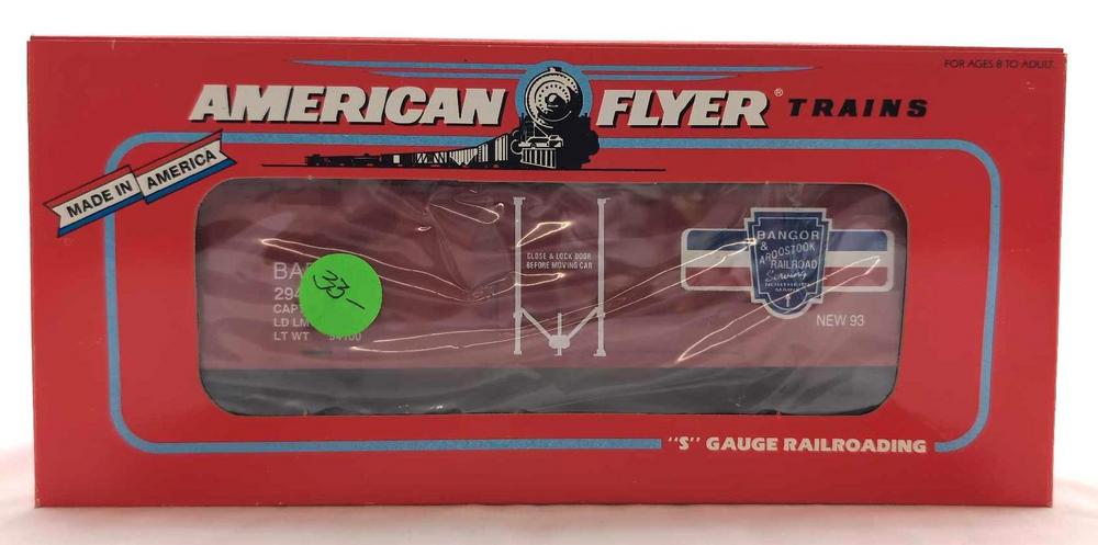 Modern Era American Flyer S Gauge 48316 State and Maine Bangor & Aroostook BAR refrigerator car in original box, unrun C9-10. Box shows little wear, price sticker, very square and solid.