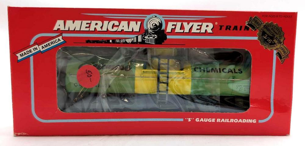 Modern Era American Flyer S Gauge 48406 Celanese Chemicals tank car in original box, unrun C9. Box has some minor corner wear, otherwise very square and very solid, price sticker.
