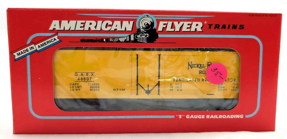 Modern Era American Flyer S Gauge 48807 NPR Nickel Plate Railroad Refrigerator Car in original box, unrun C9. Box shows little wear, price sticker, very square and very solid.