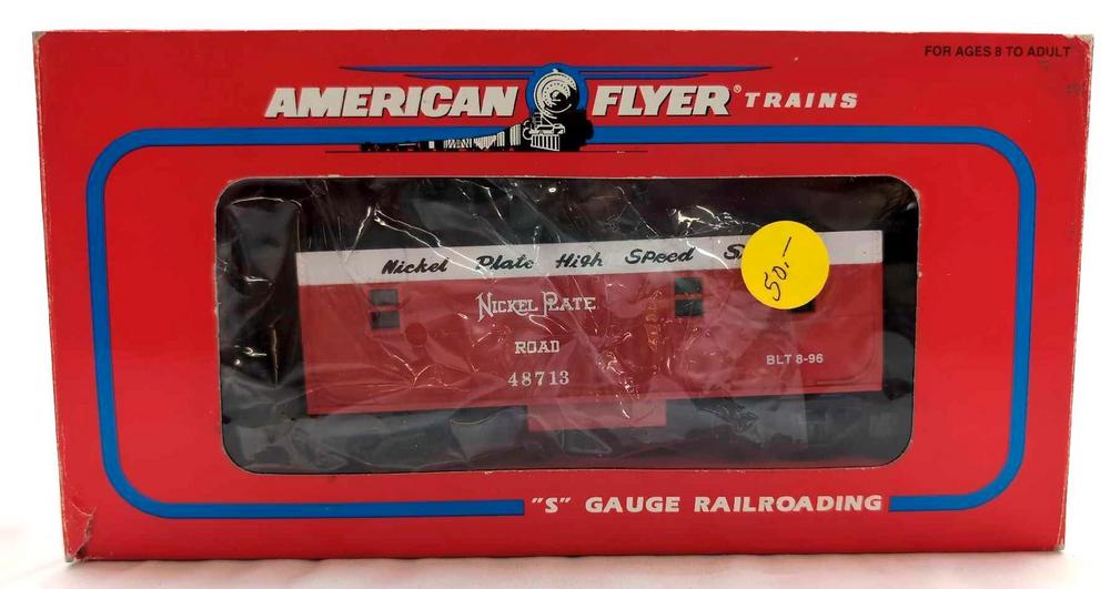 Modern Era American Flyer S Gauge 48713 NKP Nickel Plate Road illuminated caboose in original box, unrun C9-10. Box shows light wear, price sticker, very square and very solid.