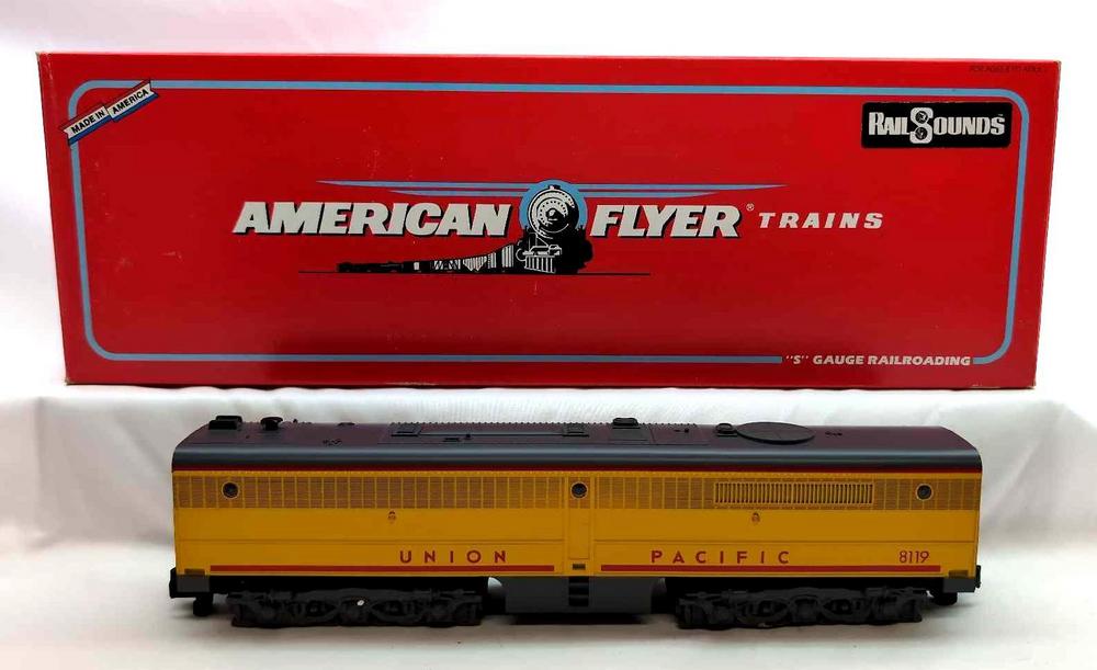 Modern Era American Flyer S Gauge 48119 UP Union Pacific Alco PB-1 diesel locomotive with diesel RailSounds in original box with instructions and literature, 5469 sound activation button, very lightly run C8. Box shows little wear, very square and solid.