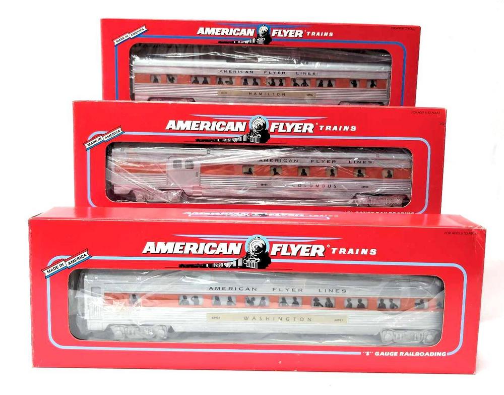 Modern Era American Flyer S Gauge 49605 NH New Haven 3 Car Passenger Set in original box, C8 run time. Observation, vista dome and observation cars. Boxes show light wear around flaps, price sticker, square and solid.
