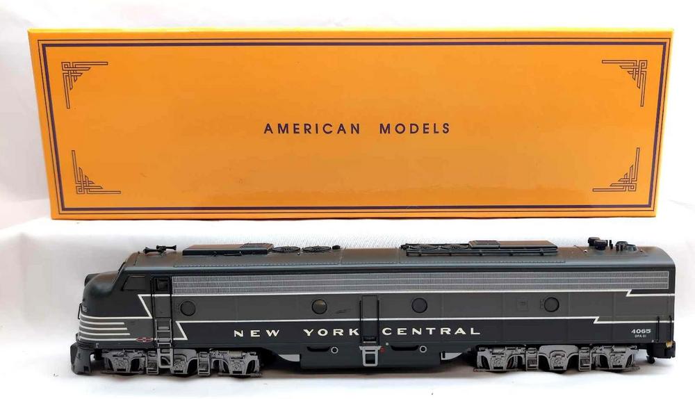 Modern Era American Models S Gauge NYC New York Central E-8 diesel locomotive A unit number 4065, AC Hi-Rail with Sound Unit in original box with instructions. Pilot has been glue repaired but is missing a piece. Missing both rear steps. Train should clean C5. Box shows little wear, very square and very solid.