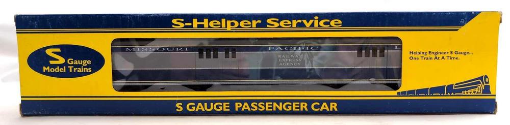 Modern S-Helper S Gauge Missouri Pacific REA Railway Express Agency Postal car in box, should clean C7+. Box shows very light surface wear, black marker, very square and very solid.