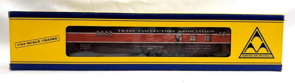 Modern Era American Models S Gauge TCA 70 foot heavyweight City of San Antonio RPO Railway Post Office Convention Car 2006 in original box, C8 light run time. Box shows little wear, very square and very solid.