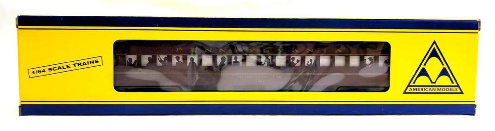 Modern Era American Models S Gauge 1462 PRR Pennsylvania 70 foot heavyweight observation car in box, C8+ with light run time. Box shows little wear, very square and very solid.