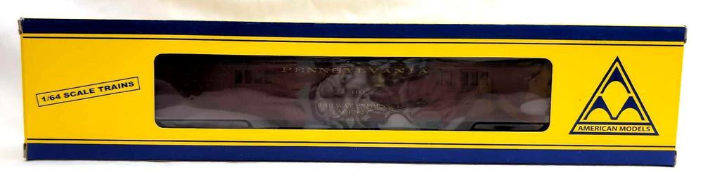 Modern Era American Models S Gauge 1102 PRR Pennsylvania 70 foot heavyweight Railway Express Agency baggage car in original box, C8+ light run time. Box shows little wear, very square and very solid.