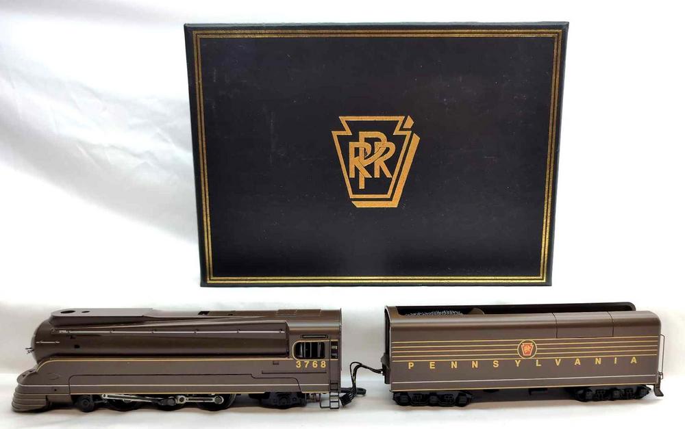 Modern Era American Models S Gauge 3768 PRR Pennsylvania K4 steam locomotive and tender, AC Hi-Rail, chug, smoke, whistle and bell in Bronze in original box with literature and peripherals. Loco has a couple very small semi-clear droplets under engineer's cab window. Train otherwise looks C8 with light run time. Box shows little wear, styrofoam shows little wear, very square and very solid.