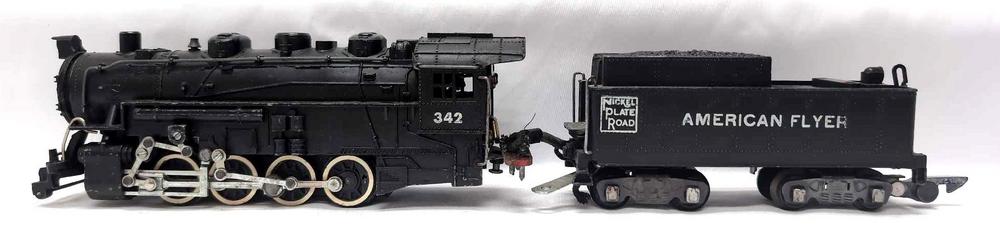 Postwar American Flyer S Gauge 342 NKP Nickel Plate Road 0-8-0 die-cast steam switcher and tender. Tender has slightly bent/dinged steps. Train looks really nice C6+.
