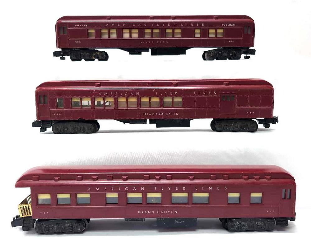 Postwar American Flyer S Gauge 952 Pikes Peak Pullman coach, 953 Niagara Falls combine and 954 Grand Canyon red heavyweight passenger cars. 952 has a repaired corner, 953 has two very small chips and a very small crack, 954 observation platform is slightly relaxed. Trains look C6.