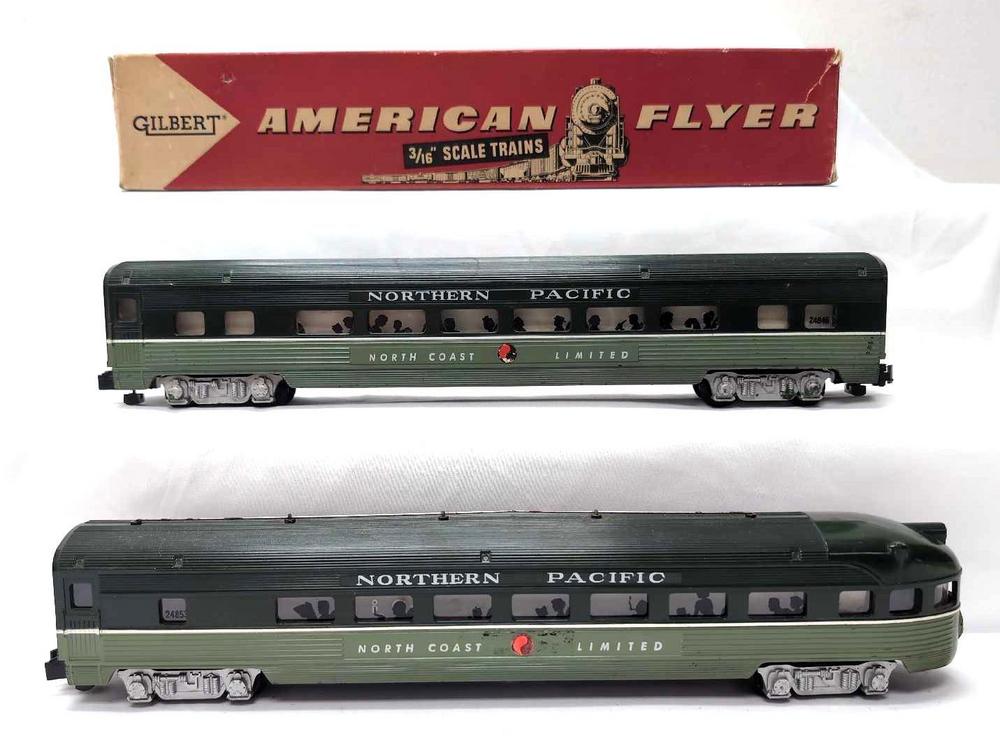 Postwar American Flyer S Gauge 24846 coach and 24853 observation NP Northern Pacific passenger cars with silhouettes. Observation car has crack at drumhead, otherwise trains look C6. 24853 original box, partially missing inner coupler protection flap, detached inner flaps. Box shows light wear, still fairly square and solid.