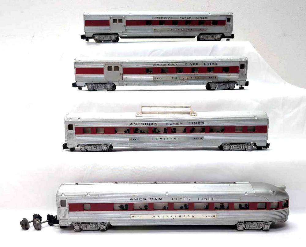 Postwar American Flyer S Gauge two 960 Columbus combine, 962 Hamilton vista dome and 963 Washington observation, red stripe passenger cars with a couple very small minor touchups, very nice C6 with passenger silhouettes. Trains should clean and polish to look slightly better.