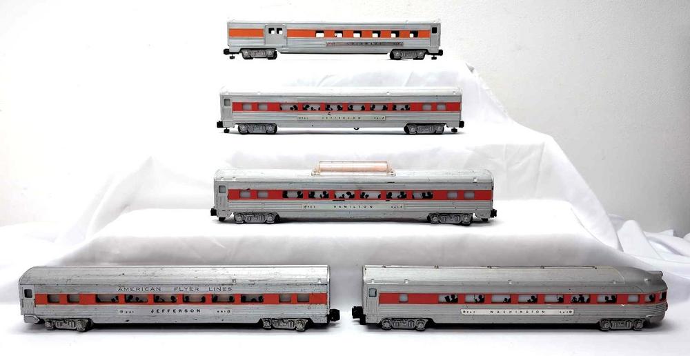 Postwar American Flyer S Gauge 960 Columbus combine, two 961 Jefferson coaches, 962 Hamilton vista dome and 963 Washington observation, orange stripe passenger cars with passenger silhouettes. Trains have repainted stripes. Some silver is repainted. 963 has an uncracked end at drumhead. Trains otherwise look nice C6 area, four cars are correctly marked with TCA Restoration stickers.