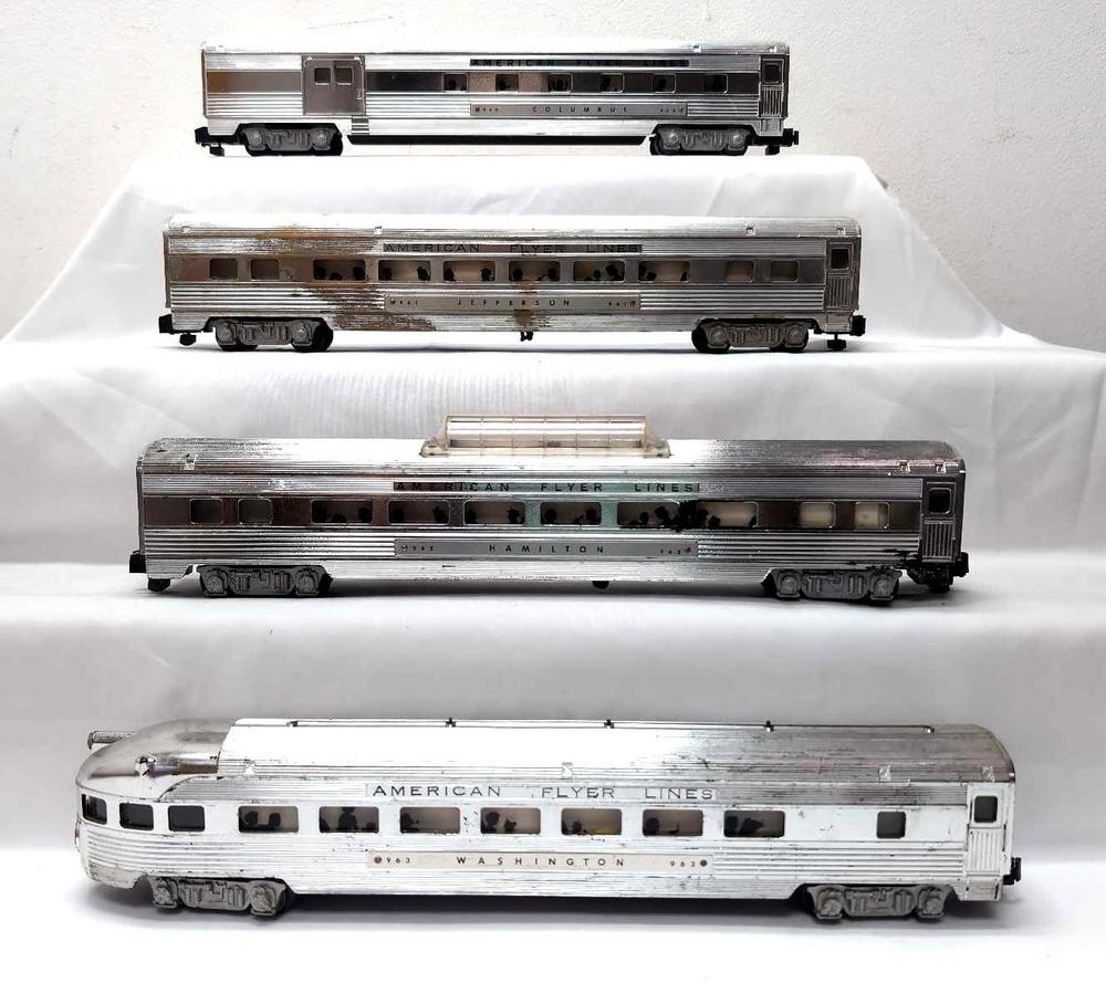 Postwar American Flyer S Gauge 960 Columbus combine, 961 Jefferson coach, 962 Hamilton vista dome and 963 Washington observation, chrome plated passenger cars with passenger silhouettes, C6. Included are five red and white Reproduction boxes in excellent square and solid condition with handwritten identifications.