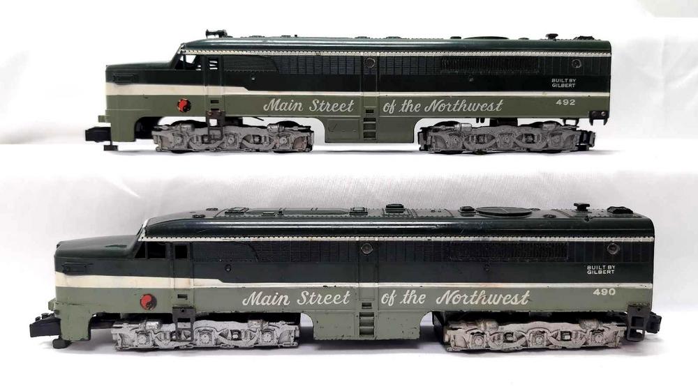 Postwar American Flyer S Gauge 490 and 492 Northern Pacific Alco PA-1 diesel locomotives, powered unit has full radio antenna, missing horns, two rivet steps. Dummy unit has some dark spots/touchups on roof, partially missing one step, single rivet steps. Trains otherwise look C6 area. Included are two red and white Reproduction boxes.