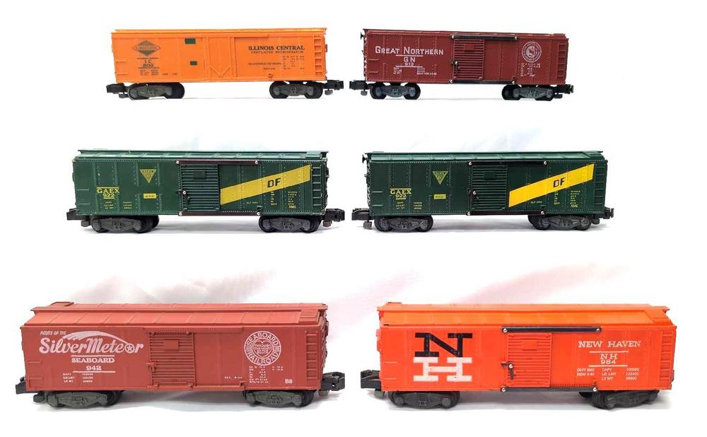 Postwar American Flyer S Gauge 802 IC Illinois Central reefer, 913 GN Great Northern box car, two 922 GAEX box cars (one has a chipped and cracked catwalk end), 942 Seaboard Silver Meteor boxcar and 984 NH New Haven box car (missing one door nib). Some cars have some minor very light surface rust on door guides, otherwise trains look C6 to C7+.