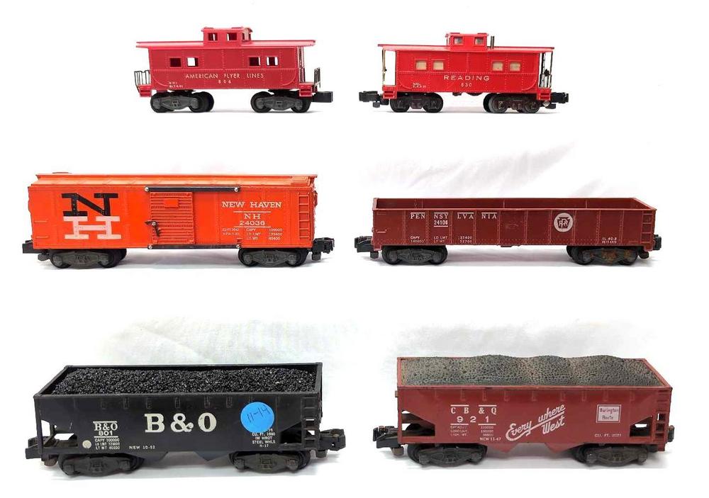Postwar American Flyer S Gauge 24036 NH New Haven box car, 24106 Pennsylvania sand car, 921 CB&Q Chicago, Burlington and Quincy hopper with coal load, 801 B&O Baltimore and Ohio hopper with coal load, 630 Reading illuminated caboose and 806 American Flyer Lines caboose, freight cars with various couplers, some are conversions, some missing steps, rust on door guides. Trains otherwise look C6.