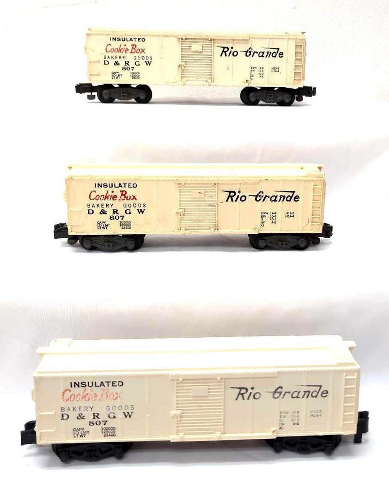 Postwar American Flyer S Gauge three 807 D&RGW Cookie Box, box cars. One car has Pike Master couplers, C6. Other two have knuckle couplers, one is C6 other is more C5 with chipped catwalk ends. One very square and solid, red and white Reproduction box included.