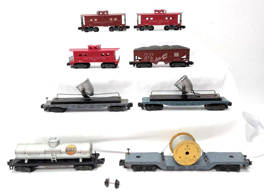 Postwar American Flyer S Gauge 936 American Flyer Lines depressed center cable reel flat car, two 934 floodlight cars (gray and blue frames), 921 CB&Q Chicago, Burlington and Quincy hopper with coal load and missing steps, 24310 Gulf single dome tank with missing steps, 938 painted American Flyer Lines caboose, 24627 unpainted American Flyers Lines caboose and 977 American Flyer Lines operating action caboose. 921 is missing steps, 24310 is missing steps, 977 has cracked catwalk ends. Trains should clean C6 area.