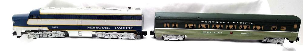 Modern Era Lionel American Flyer S Gauge 8113 MP Missouri Pacific Alco PA-1 non-powered dummy diesel locomotive and 8925 NP Northern Pacific North Coast Limited coach. Loco has tiny touchup in front of horns, horns are detached but included, C7+. Coach looks unrun C8.