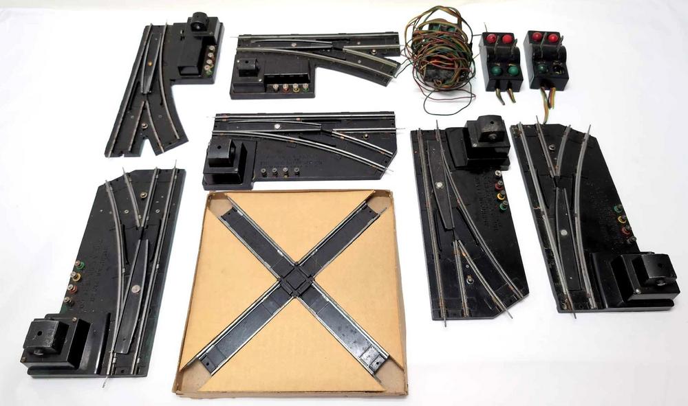 Postwar American Flyer S Gauge three pairs of Remote Control switches with double throw controllers & 725 90 degree crossover in original box, C6. Box is fully intact with good corners.