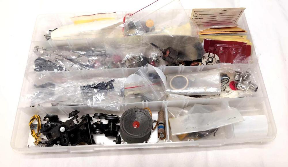 Postwar American Flyer S Gauge plastic bin of parts, pieces and components such as; speakers with electronics, pilot truck assemblies, wheel sets, motor armatures, fields, side rods, coupler mounting pins, steam loco drive wheel, knuckle couplers caboose illumination socket, smoke unit, motor brushes and springs, various screws, and More. Please view the photos of the items in this lot carefully as they are being sold as they are shown in our photos with NO returns or refunds.