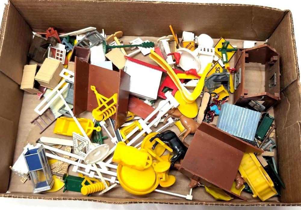Postwar Bachmann Plasticville pieces, parts and components, the little items you need to finish that certain kit with. Tables, lounge chair, horses, rake for farm tractor, signs, out house, phone booth, hospital furnishings, doors, windows, street lamps, playground slide, bird bath, fence sections and More. Overall excellent clean condition. Please view the photos of the items in this lot carefully as they are being sold as they are shown in our photos with NO returns or refunds.
