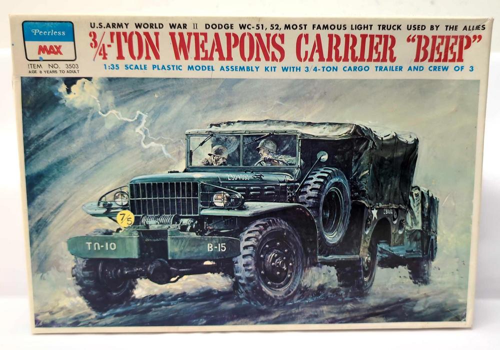 DescriptionPeerless Max 1/35th scale 3503 U.S. Army World War II Dodge WC-51, 52, 3/4 Ton Weapons Carrier Beep, with 3/4 Ton Cargo Trailer and crew of 3, NIB. This is an open box, sealed bag kit with all parts accounted for and an original instruction sheet and other literature, as seen in the photos. Please view photos carefully as these items are sold as shown in our photos with no refunds or returns.