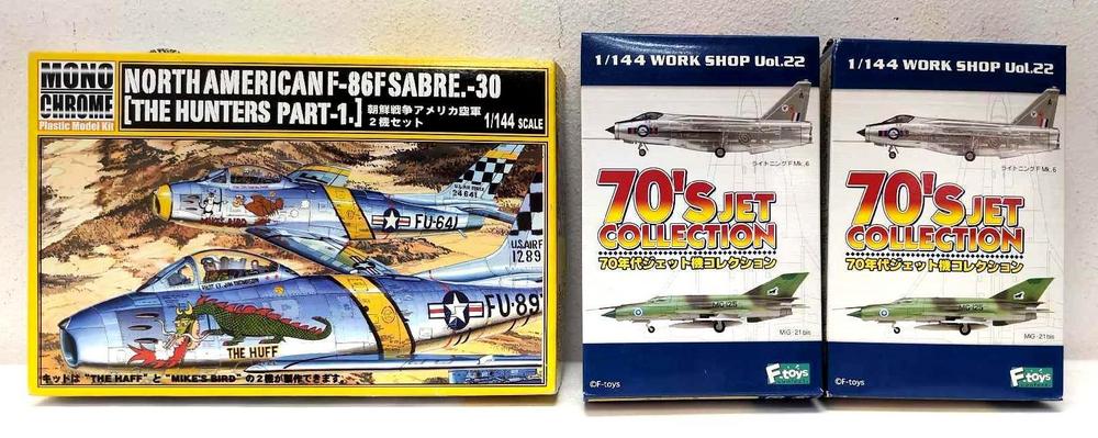 DescriptionF-toys and Mono Chrome 1/144 scale unbuilt jet airplane model kits in original boxes. Two F-toys 1/144 Work Shop Vol.22 70's Jet Collection. Mono Chrome MCT-005:1000 North American F-86F Sabre -30. These are open box, sealed bag kits with all parts accounted for and an original instruction sheet and other literature, as seen in the photos. Please view photos carefully as these items are sold as shown in our photos with no refunds or returns.