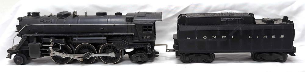 DescriptionPostwar Lionel O Gauge 224E 2-6-2 steam locomotive and Lionel Lines tender with whistle (illegible number). Trains should clean and polish to look really nice C6+. Please view the photos of the items in this lot carefully as they are being sold as they are shown in our photos with NO returns or refunds.