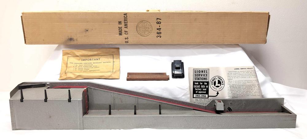 DescriptionPostwar Lionel O Gauge 364 Lumber Loader in original box with components envelope, five lumber, 364C control button, Service Station literature, original instructions sheet, original inspection slip. Loader should clean to look C6++ in hammer tone finish. Box is very square and solid with a faded label with original $14.75 Hines Hobby House price sticker. Please view the photos of the items in this lot carefully as they are being sold as they are shown in our photos with NO returns or refunds.
