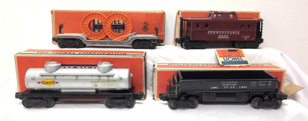 DescriptionPostwar Lionel O Gauge 3469X Automatic Dump Car, 6465 Sunoco single dome tank car, 6561 Lionel Lines cable reel car, 6417 Pennsylvania N5c porthole caboose in original boxes. Trains are nicer C6-7. Boxes have missing, detached and tape repaired flaps. All are fairly clean, bright, square and solid to varying degrees. Please view the photos of the items in this lot carefully as they are being sold as they are shown in our photos with NO returns or refunds.