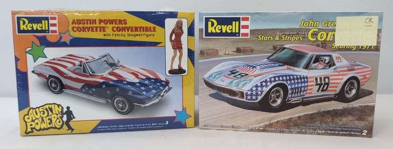 Two Revell Corvette model kits, one is Austin Powers Corvette with Felicity Shagwell Figure, 85-2333 and the other is John Greenwood's "Stars & Stripes" Corvette Sebring 1971, 85-2825. Both kits are 1:25 scale. 85-2528 is an un-assembled open box kit appearing complete containing parts on sprue in bag, instructions, decals, etc. Box shows little wear, bright, clean, square and solid. 85-2333 kit is Mint, factory sealed with un-torn cellophane overwrap.