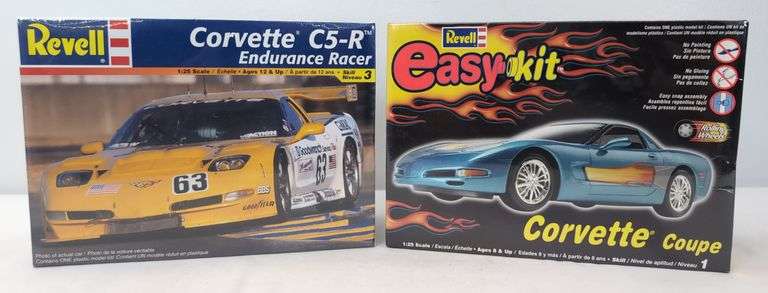 This lot includes two Revell 1:25 scale model kits of the Chevrolet Corvette. One kit is a C5-R Endurance Racer 85-2354 , while the other is a Corvette Coupe 'Easy Kit' 85-1936. Both are Mint, factory sealed kits with un-torn cellophane overwraps.
