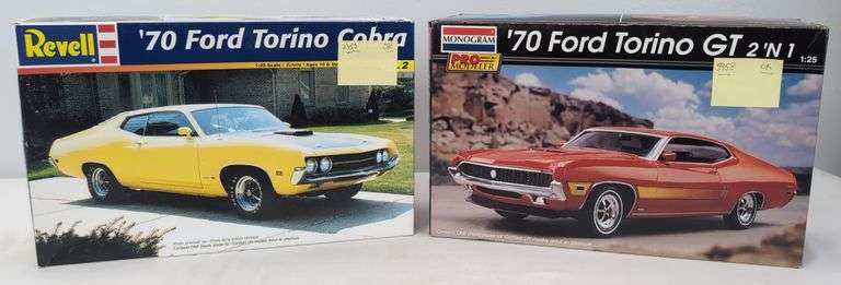 Two model car kits, including a '70 Ford Torino GT 2 'N 1 in 1:25 scale by Monogram, 85-5958 and a '70 Ford Torino Cobra in 1:25 scale by Revell, 85-2353. Both kits are un-assembled open box kits appearing complete containing parts on sprue in factory sealed bags, literature, instructions, decals, etc. 85-2353 has both white and gray mold floor pan and frame/chassis. White parts are probably factory sample parts, entire kit may be a factory sample, unmarked. Boxes show little wear, bright, clean, square and solid.