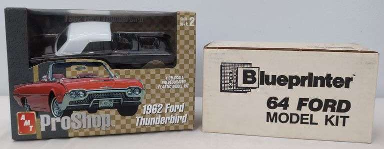 This lot includes two Ford model car kits. The first is an AMT ProShop 1962 Ford Thunderbird, a 1:25 scale, pre-decorated plastic model kit, 31834. The second is a Blueprinter 1964 Ford Galaxie 500 XL model kit, #6990. Un-assembled open box kits appearing complete containing parts on sprue in factory sealed bags, literature, instructions, decal sheet, etc. Boxes show little wear, bright, clean, square and solid.
