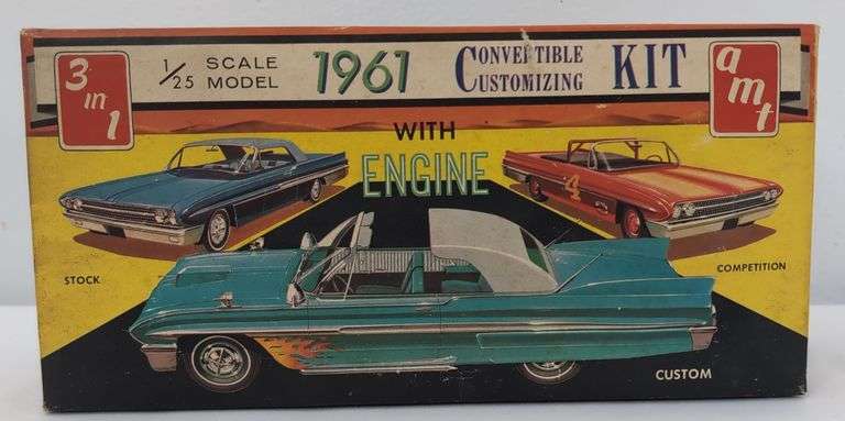 AMT 1961 Convertible Customizing Kit 3 in 1 Model Car Kit, K-111 Ford Conv. Kit is partially painted, partially assembled, parts all off sprue. No instructions or decals. Box shows some dirt/grime on one end, otherwise fairly bright, square and solid. Please view the photos of the items in this lot carefully as they are being sold as they are shown in our photos with NO returns or refunds.