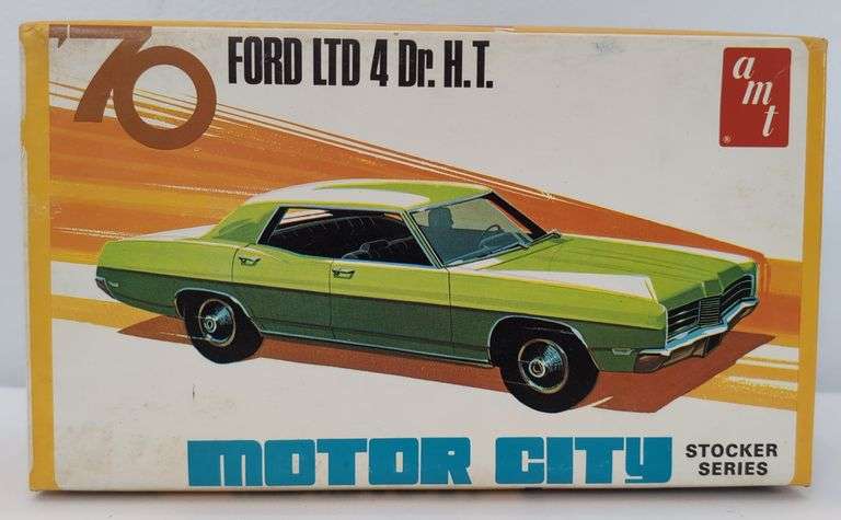 AMT 1970 Ford LTD 4 Dr. H.T. Motor City Stocker Series Model Car Kit. 1/25 Scale. X851-100. Kit is an un-assembled open box kit appearing complete containing loose parts, instructions, tires, etc. Box shows little wear, bright, clean, square and solid.