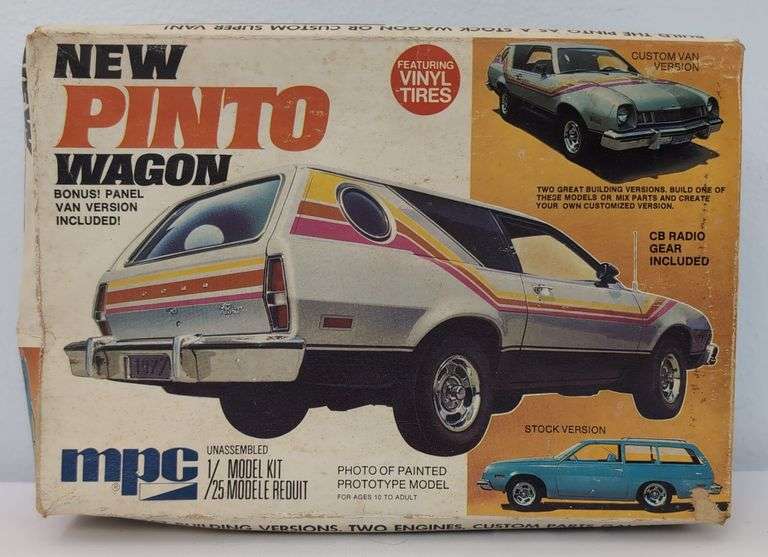 MPC 1/25 scale model kit of the New Pinto Wagon, 1-7728. This is an un-assembled open box kit appearing complete containing parts on sprue, loose parts, instructions, decals, etc. Box shows signs of age and moisture warpage. Box is bright, clean, fairly square and solid.
